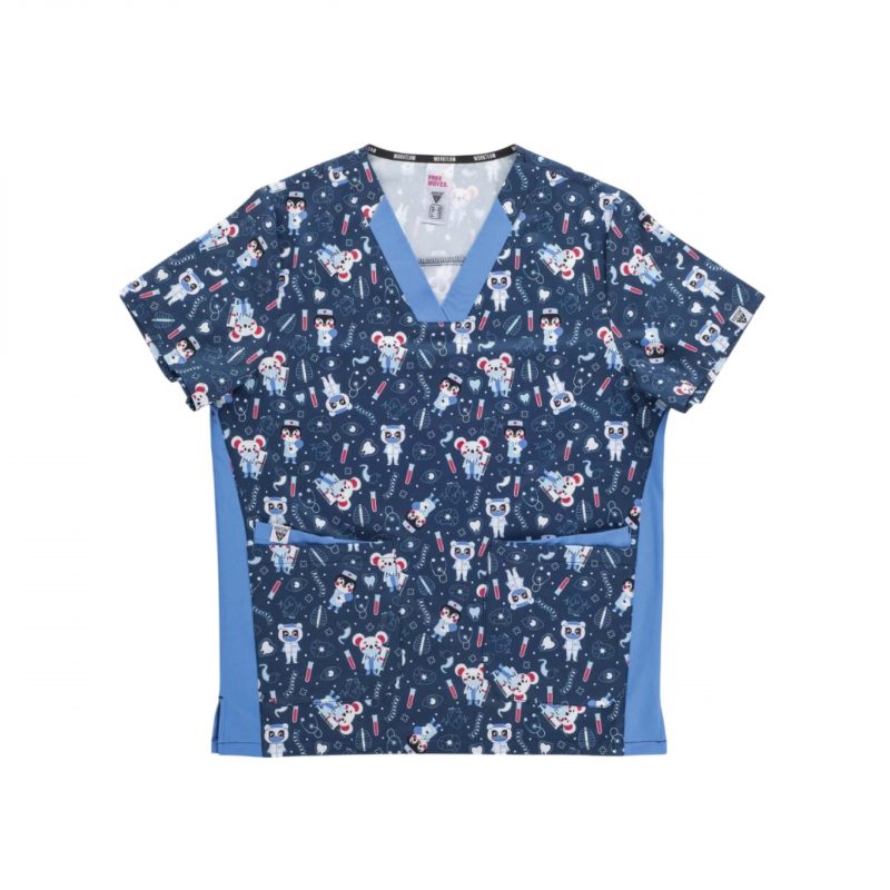 Camisola estampada unissexo com dois bolsos. Decote em V. Aberturas laterais.