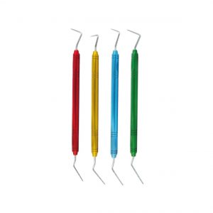 As extremidades finas penetram no fio entrelaçado e as suas ligeiras serrilhas evitam que o instrumento deslize e agrida o tecido gengival; Os instrumentos serrilhados são recomendados para posicionar os fios no sentido axial, já as espátulas deslizantes sem serrilha são mais indicadas em situações que se trabalha com movimento deslizante horizontal; Ligeiramente serrilhado, arestas não cortantes; Espátula pequena com ângulo de 45º em relação ao cabo, à direita e esquerda respectivamente, para permitir um posicionamento circular na preparação sem ter de girar o instrumento para usar a outra extremidade.