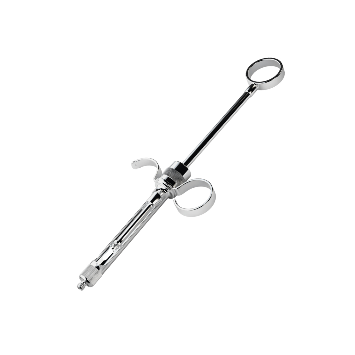 Seringa de aço inoxidável de alta qualidade. Projetado para proporcionar maior conforto durante o processo de injeção. Tem um sistema de anel de aperto duplo para garantir maior segurança, equilíbrio e controle durante a injeção. Esterilizável. Com gancho duplo, de design atraente, que torna a aspiração eficaz.