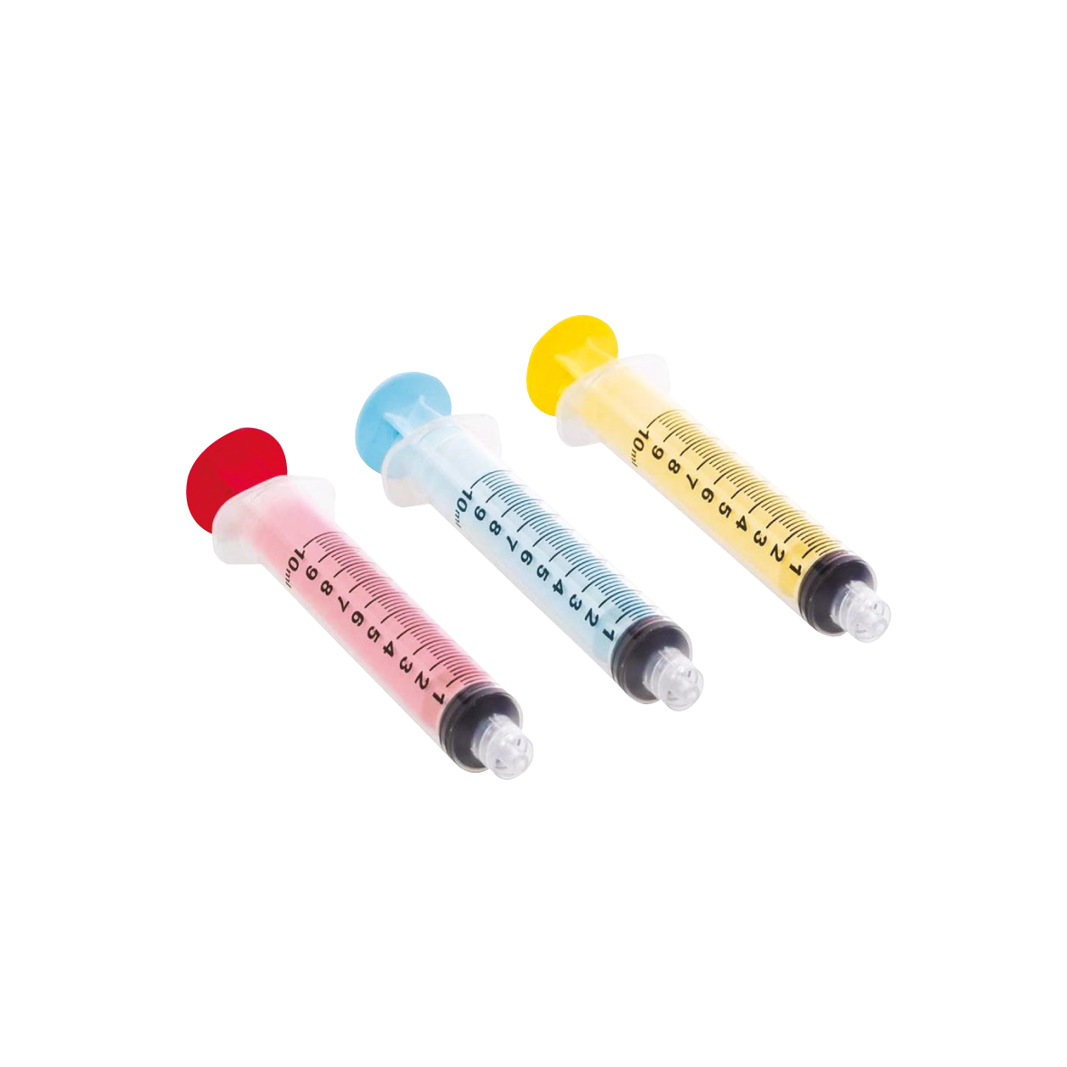 Seringas sem látex. Codificado por cores, para uma rápida e fácil organização das seringas para cada solução de irrigação. Aumenta a segurança, minimiza o risco de mudar as seringas.